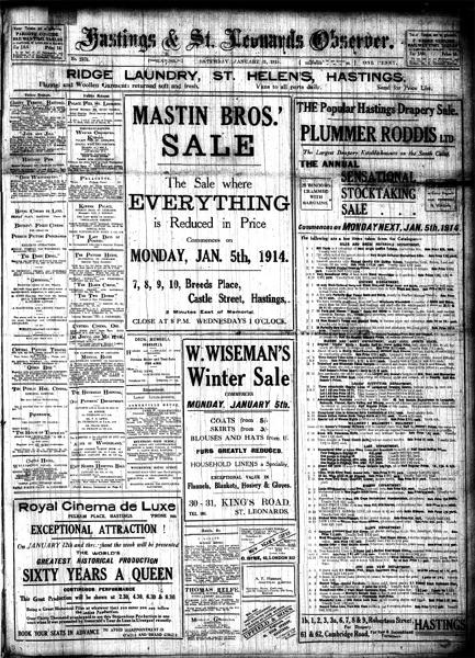 The Hastings & St Leonards Observer, commonly referred to as just the Hastings Observer was first published in 1859. During the First World War period it was a weekly paper, published every Saturday. It is still in print today and is published every Friday. We have digitised every edition of this newspaper from 3 January 1914 to 27 December 1919.